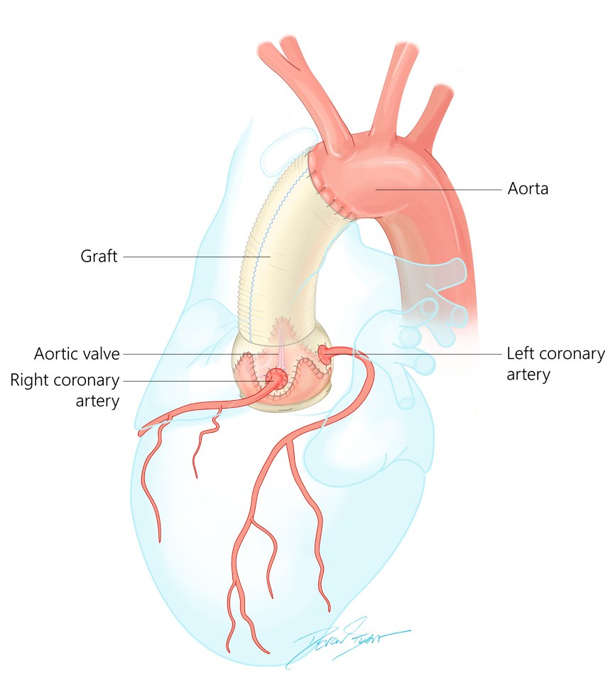 Doctors remove the section of the aorta affected by the aneurysm and replace the tissue with a synthetic tube called a graft. The left and right coronary arteries, which originate from the aortic root, are carefully detached from the diseased portion and then reattached to the graft in their proper locations.